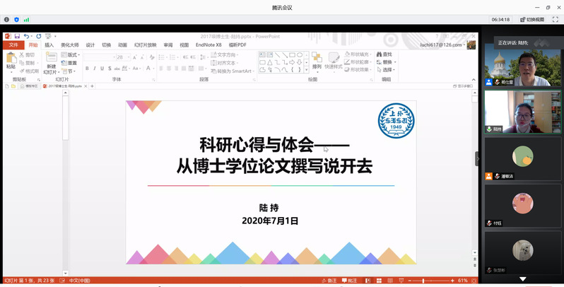 2017级博士生陆持同学的发言题目为“科研心得与体会——从博士学位论文撰写说开去”。陆持同学认为,博士学位论文的撰写需要历经一个循序渐进、厚积薄发的过程,它是一次科研经验的汲取和一场学术技能的训练。从前期积累、探索未知、明确选题、阅读文献、撰写论文到修改论文,每一个环节都至关重要。学位论文的撰写是一个发现问题、分析问题、研究问题、解决问题及反思问题的积极的动态过程,也是漫漫科研路的缩影。