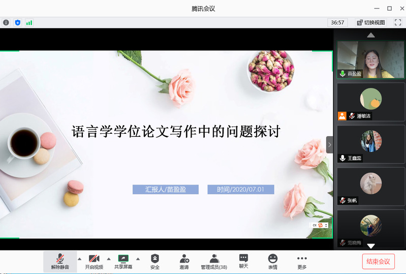 2017级博士生苗盈盈同学以“语言学学位论文写作中的问题探讨”为发言题目,从语言学论文的写作选题、写作方法、语料选取以及论文的创新性、论文结构、论文整体的学术定位和学术价值出发,结合她本人学位论文写作过程,与同学们分享了自己在语言学论文写作过程中所遇到的问题和解决问题的办法。