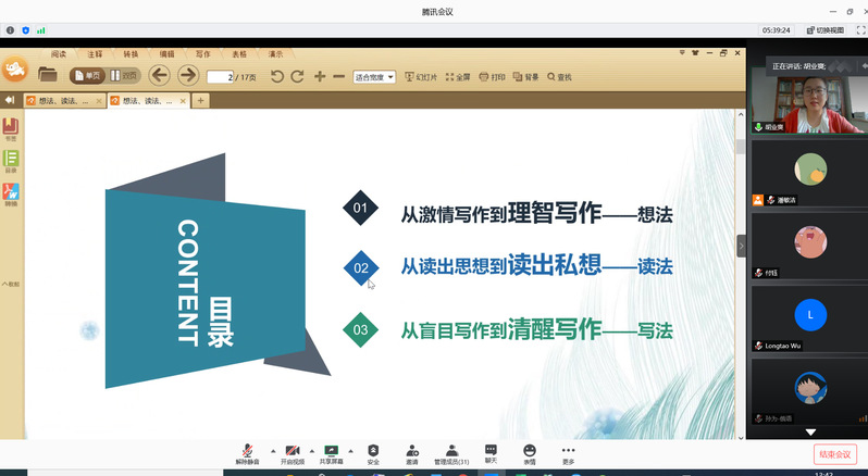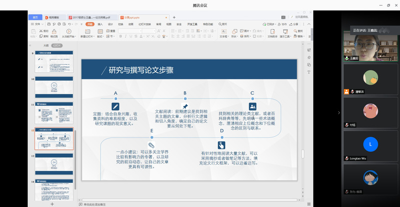 2017级博士生胡业爽同学以“浅谈博士论文写作中的想法、读法和写法”为发言题目,从自己的博士学位论文《中国当代乡土小说地域文化的俄译研究》入手,在想法、读法和写法三个层面,分享了自己在博士学位论文撰写中所总结出的经验和教训。