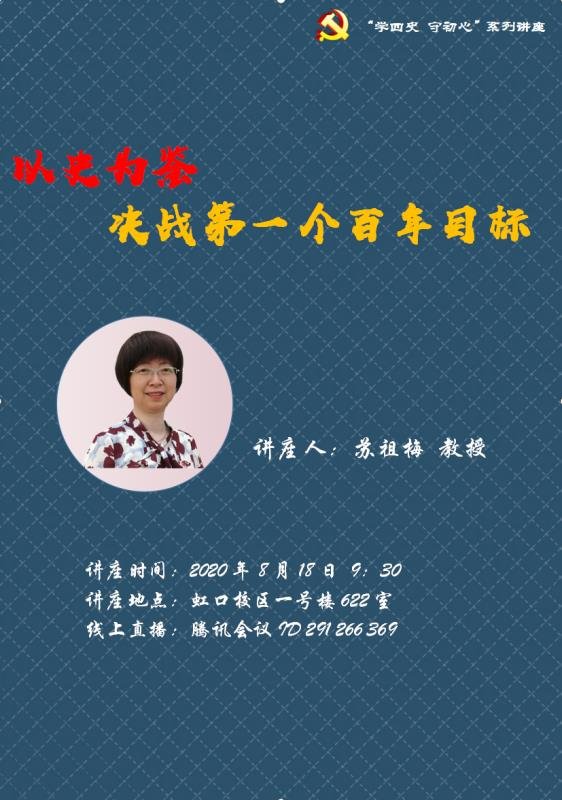 “两个一百年”的第一个一百年奋斗目标期限将近,以史鉴今、资政育人,重视从历史中汲取智慧和力量是中国共产党长期以来的优良传统。2020年8月18日上午,教工党支部书记苏祖梅教授为学院所有学生党员上了一堂题为“以史为鉴——决战第一个百年目标”的主题党课。全院近四十名党员师生线上线下共同参加了本次党课学习,组织部副部长刘燕老师也莅临了本次示范党课的现场给予指导。