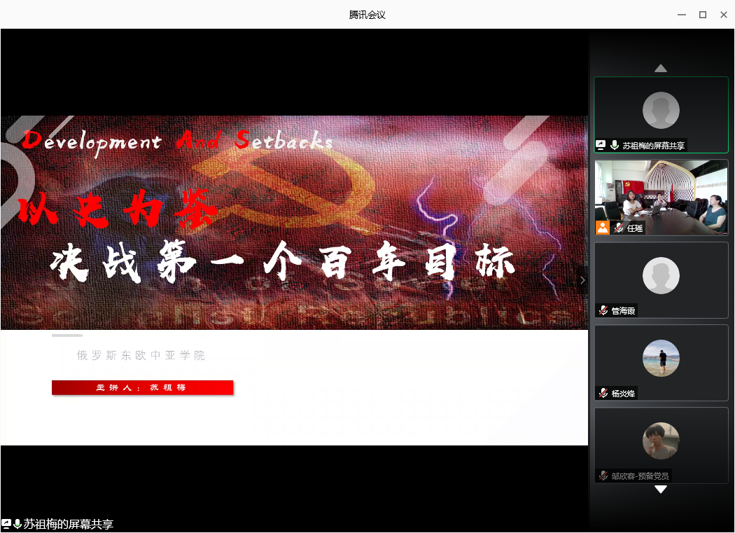在决战第一个百年目标之际,苏祖梅教授带领党员们再次回顾了三十多年前在社会主义发展史上最重大的一场悲剧,苏共的亡党、苏联的解体让前苏联的共产党和人民付出了惨痛的代价。苏教授通过生动的史料充分剖析了苏共亡党、苏联解体的内因、外因,并结合习近平总书记与之相关的各类重要论述及讲话精神,阐述了“四史”教育的现实意义。当前我国正处在决胜全面建成小康社会,实现第一个百年目标的关键收官阶段,十八大以来,中国共产党始终保持住各项战略、工作、政策、措施的连续性和前瞻性,带领全国人民把新时代中国特色社会主义推向前进。党课最后,苏教授再次提醒党员青年们要牢记苏共亡党亡国的历史教训,常怀忧患意识;深入学习贯彻习近平新时代中国特色社会主义思想,紧密团结在以习近平同志为核心的党中央周围,坚定跟党走,增强“四个意识”;认真学习“四史”,坚定社会主义信仰,坚定马克思主义信仰,做共产主义事业的可靠接班人;要学法守法,懂得用法维护自身权益。在即将夺取全面建成小康社会伟大胜利,踏上实现第二个百年奋斗目标的新征程上,作为青年党员,要志存高远,同时又脚踏实地,练就过硬本领,在矢志奋斗中谱写新时代的青春之歌。