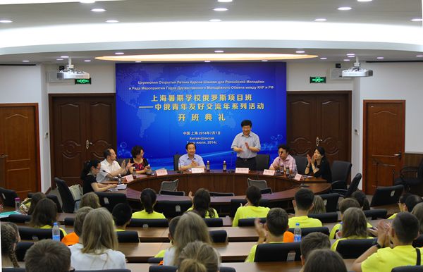 在柴可夫斯基《如歌的行板》和中国经典乐曲《梁祝》的优美旋律当中,“上海暑期学校俄罗斯项目班——中俄青年友好交流年系列活动”开班仪式于2014年7月8日上午9点在上海外国语大学隆重举行。上海外国语大学校长曹德明,上海市教委副主任李瑞阳,上海市教委国际交流处处长杨伟人,上外俄语系主任章自力,上海市教委国际交流处项目官员葛静怡等领导出席了开班仪式,上外国际文化交流学院院长张艳莉担任主持,共计约80名中俄学生参加了开幕式。