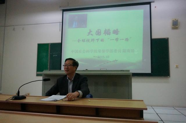 2015年11月23日中午,应上外俄语系、俄罗斯研究中心的邀请,中国社会科学院荣誉学部委员陆南泉做客俄语系,并为同学们展开了题为《大国韬略——全球视野下的 “一带一路”》 之俄罗斯前沿问题研究系列讲座。俄语系主任章自力出席并担任主持人。在此次讲座中,陆讲授主要讲述了“一带一路”的形成过程、构想背景及其特点、“一带一路”与欧亚经济联盟的关系和在实施中可能遇到的矛盾和风险这五个方面的问题。