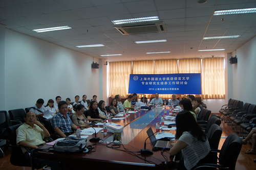 2013年俄语语言文学专业研究生培养工作研讨会于8月19日下午在我校举行。本次研讨会由我校俄语系主办,旨在探讨俄语语言文学研究生的培养方案及创新机制,切实推动研究生教育的改革与发展,搭建俄语语言文学专业研 究生培养交流平台,全面提高研究生的创新能力和培养质量。黑龙江大学校学术委员会人文艺术学部主任、俄罗斯语言文学与文化研究中心学术委员会主任张家骅, 俄罗斯语言文学与文化研究中心主任孙淑芳,北京外国语大学俄语学院副院长黄玫,黑龙江大学俄语学院副院长白文昌,苏州大学俄语系主任赵爱国,复旦大学俄语系主任姜宏,华东师范大学俄语系主任王亚民,上海外国语大学俄语系主任章自力、副系主任许宏以及上外俄语系研究生导师等20余人出席了本次研讨。研讨会由俄语系主任章自力主持。