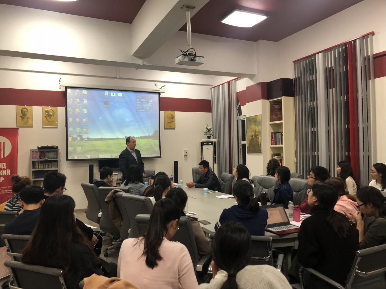 马克西姆·斯科罗霍多夫教授在《俄罗斯庄园文化现象探究》的主题讲座中,为同学们详细地介绍了庄园文化对俄罗斯贵族作家们的创作产生的深刻影响。讲座过程中,教授多次与同学们进行互动、探讨。