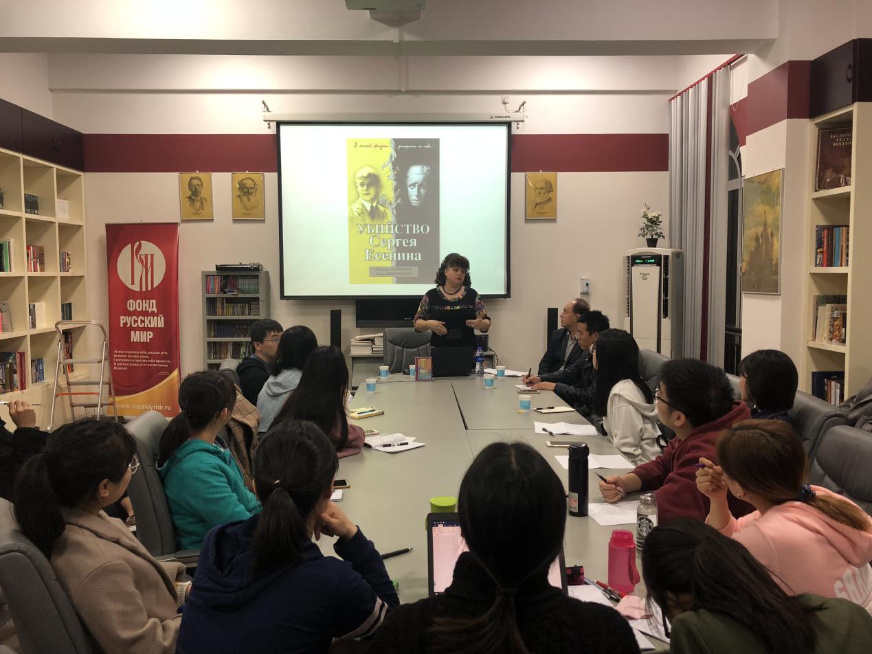 叶莲娜·科洛米采娃女士以《走近诗人叶赛宁》为讲座主题,强调了“身临其境”的重要性。她解释说,如果你不亲自去叶赛宁生活过的地方,你就无法理解更无法翻译好叶赛宁的诗歌。科洛米采娃女士还向大家介绍了她与丈夫合作出版的新书《叶赛宁之死》。叶赛宁是俄罗斯的天才诗人,他不仅在俄罗斯家喻户晓,同时也深受着世界人民的爱戴。可是这样一个热爱生活的浪漫诗人,其生命的音符却在三十岁戛然而止。关于其死因,文坛上众说纷纭。作为叶赛宁的研究者,科洛米采娃女士及其丈夫认为有必要找寻诗人英年早逝的真相,便追随着诗人生前的脚步,游历欧洲,走访美国,长达3年之久收集了第一手珍贵的资料。回国之后夫妻二人将资料整理成书,并在俄罗斯出版,夫妻二人这种探寻真理的精神深深打动了在场的同学们。