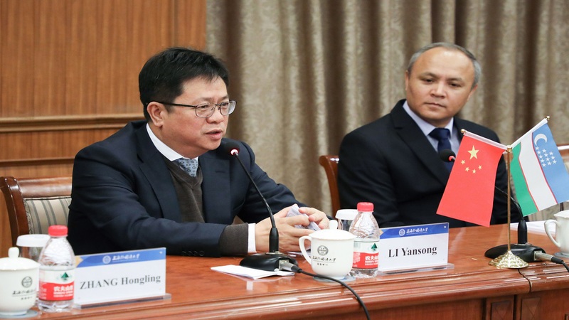 撒马尔罕外国语学院副校长如兹库洛夫·法兹力丁(Ruzikulov Fazliddin)对我校的热情接待表示感谢。随着中乌关系的不断深化,两国在教育领域的合作也不断取得成就,上外与撒外共建的孔子学院在汉语教学和人才培养方面也硕果累累,为促进中乌交流培养了众多优秀人才。两校合办的国际学术研讨会迄今已成功举办四届,这亦是两校科研合作成果的充分体现。乌兹别克斯坦世界语言大学副校长玛玛多夫·诺尔普拉特(MaMadov Norpulat)简要介绍了该校师资配备、专业设置及汉语教学情况,并表达了希望加深两校合作和两国友谊的美好愿望。乌兹别克斯坦东方学院副校长舍拉里耶夫·欧伊别克(Shelaliev Oibek)也着重介绍该校中国学研究情况。中国在政治、经济改革领域取得巨大成就,乌方希望借鉴中方先进经验以推进乌国内改革进程。同时他表达了推进两校学生互换、教师进修等方面的合作意愿。