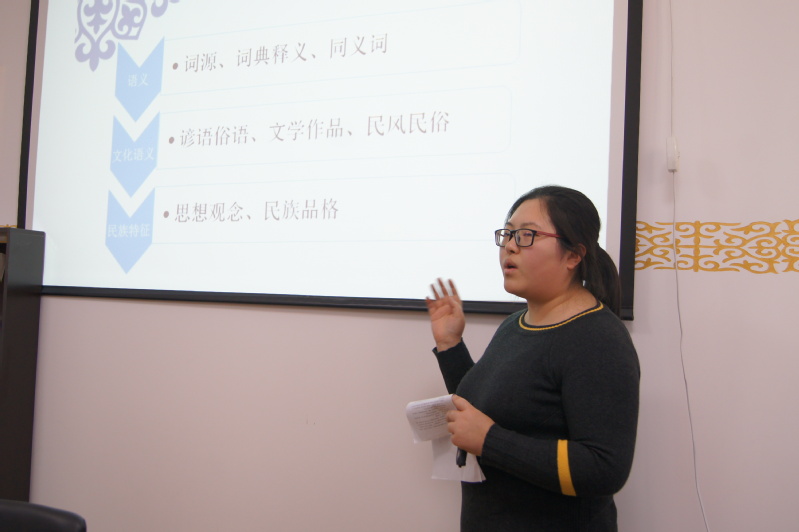 陈思宇老师从语言文化学视角,将“热情好客”一词作为哈萨克语中的观念词,对“热情好客”观念进行了分析和描写,涉及该词的词源、语义、民族文化等方面,以发掘该观念所承载的民族文化、民族品格。钱琴老师对比分析了《新编俄语教程》与《综合俄语教程》这两套教材,并就新教材编订问题提出了若干建议。许丽莎老师的报告围绕长篇小说《黑色议会,1663年纪实》中的民俗民族元素展开,指出民俗民族元素的大量使用拓宽了这部小说的历史文化空间,使其成为乌克兰文学史上的优秀作品以及17世纪乌克兰社会的“百科全书”。郑洁岚老师发言的题目是《试析普京第四任期内政外交面临挑战及政策走向》。她认为,在面临国内外严峻挑战和压力之下,普京延续了其此前的执政理念和政策,对内维护政治稳定,促进经济发展,致力于提高人民生活水平;对外实行务实灵活的全方位外交政策,在加大“向东看”力度的同时,积极寻求契机与西方改善关系,使对外交往为本国利益服务。