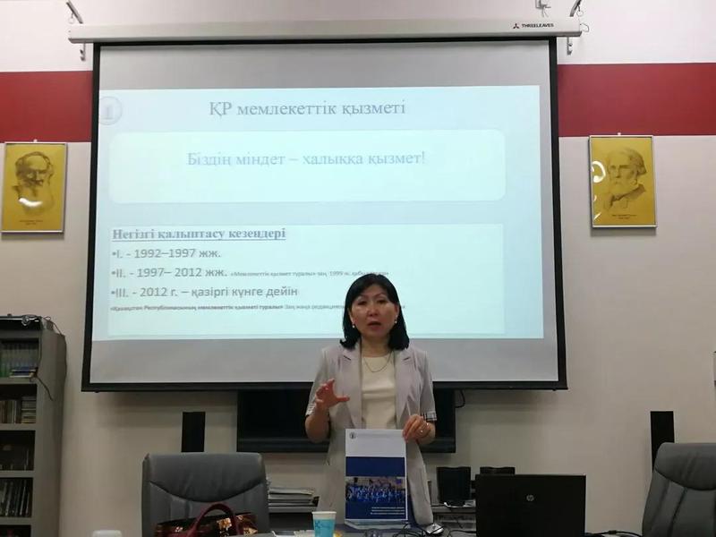 之后,教授为大家带来了《哈萨克斯坦的公共服务:发展历史和现状》主题讲座。公共服务部门体系、精英管理的选拔机制与原则、当今哈萨克斯坦公共服务机构发展的进程与趋势;进步与不足、弊端与优势、困境与机遇,我们通过Садвокасова Айгүль Какимбековна女士的讲座看到了哈萨克斯坦正经历的大刀阔斧的改革政策以及充满潜力与可能性的未来发展趋势。
