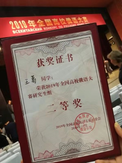 由中国教育部主办、北京外国语大学承办的2019年全国高校俄语大赛于10月27日晚在北京落下帷幕,我校俄罗斯东欧中亚学院王葛、戴丹丹双双荣获研究生组二等奖,总分名列全国第二、第五;钱书茗荣获高年级组演讲二等奖;在我院插班学习的中国石油大学克拉玛依校区的李鹏博获得低年级组三等奖。
