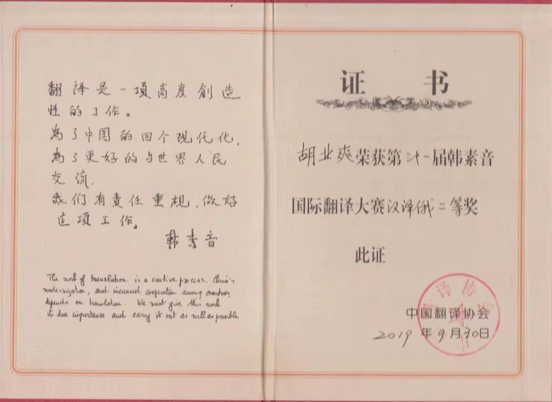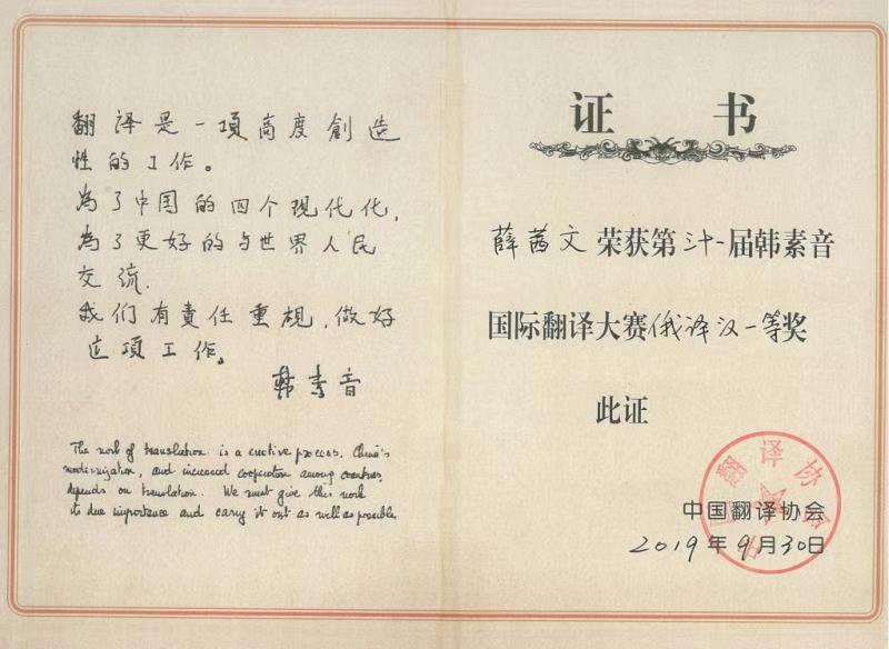 2019年11月9日,第31届韩素音国际翻译大赛颁奖仪式在京举行。我院2018级博士生薛茜文、2017级博士生胡业爽在此次翻译大赛中表现突出,取得优异成绩。薛茜文同学荣获俄译汉一等奖(第一名),胡业爽同学荣获汉译俄二等奖(第二名)。