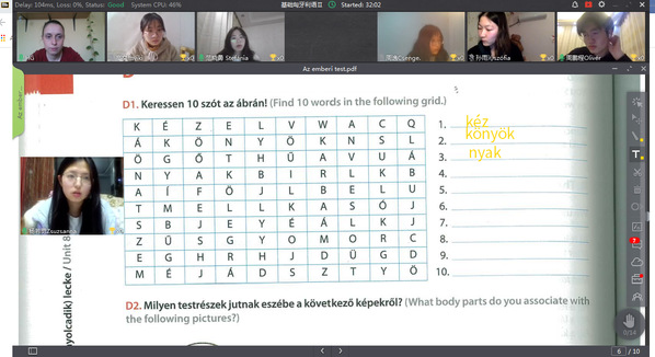 我们需要明确目标,珍惜课堂每一分每一秒进行口语训练,发音练习以及口语实践,这一切都犹如发生在现实的教室里,而不只是网络中,尽管线上教学平台的功能我也还在不断探索中。由于目前我的授课对象主要是一年级新生,他们都还是匈牙利语的初学者,所以对于我来说课上要尽可能只用匈牙利语教学也是巨大的挑战。幸运的是,这个年龄段的学生们似乎对于线上学习平台都比较熟悉(他们可以同时熟练地使用多个直播软件进行学习),他们根据每一门课的学习目标为我推荐了合适的直播平台,我们收获了不错的学习效果。就这样,学生和老师手拉手共克难关。
